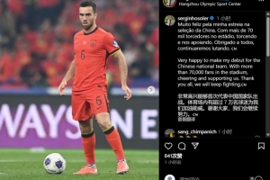 塞尔吉尼奥更新个人社媒,晒出个人赛场照,并用中英葡三种语言写道:非常高兴能够首次代表中国国家队出战。体育场内有超过 7 万名球迷为我们加油助威。谢谢大家,我们会继续努力。